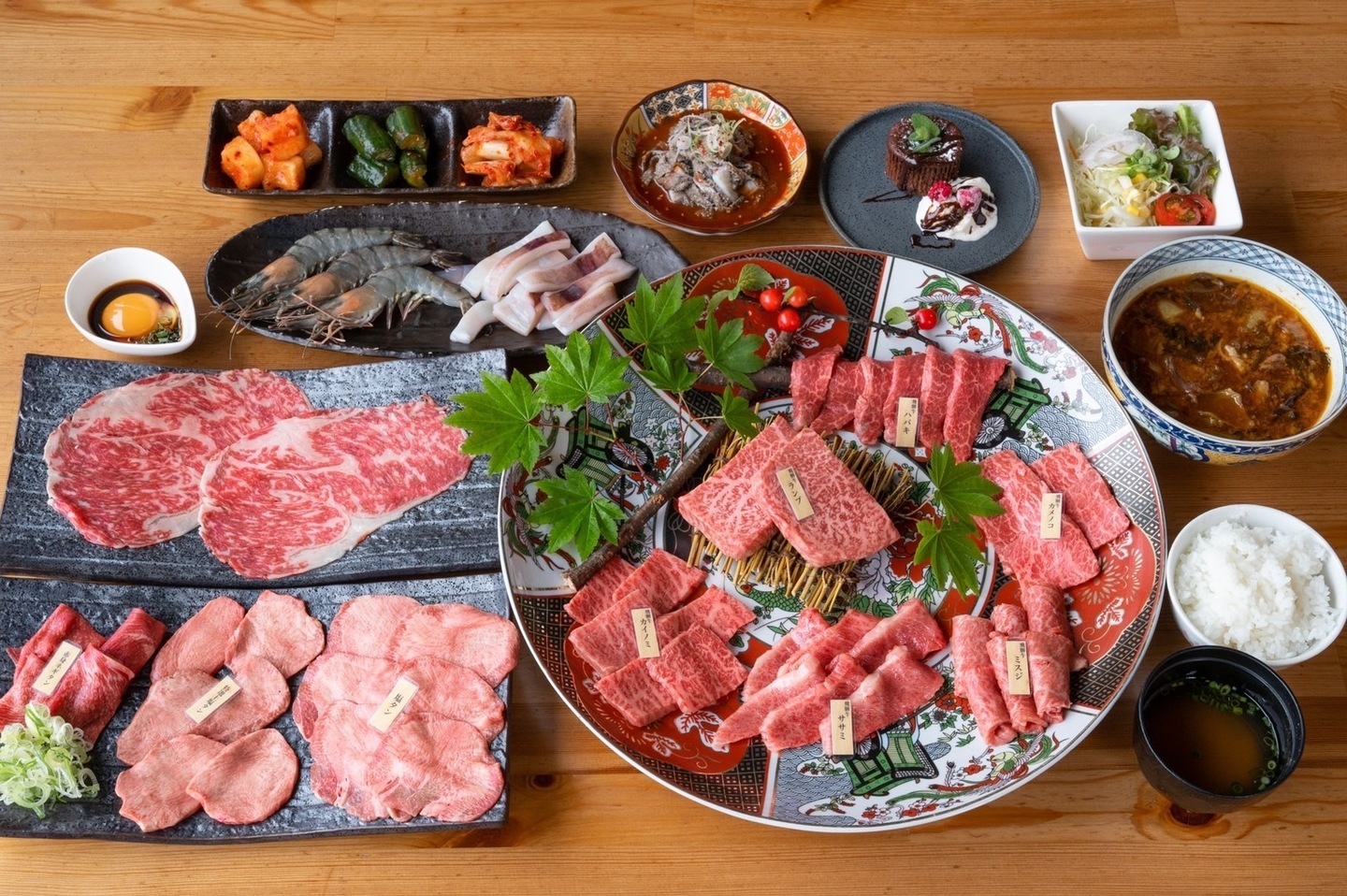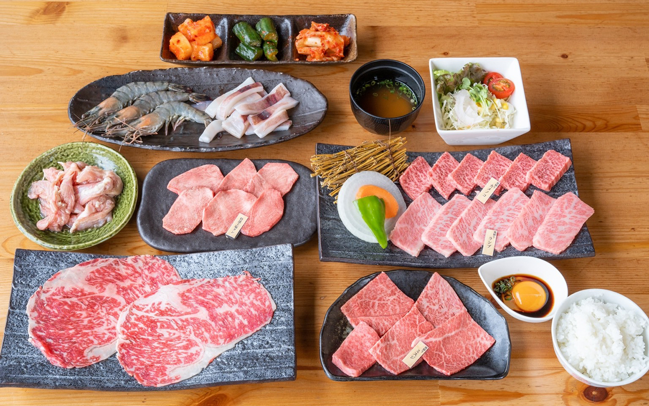 Beef tongue,Beef(boneless short rib) ,Pork,Broiler Chicken,pork sausage,Rice,Miso soup,Salad,Desert